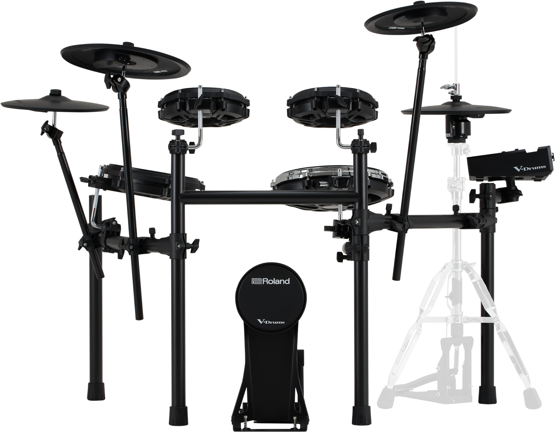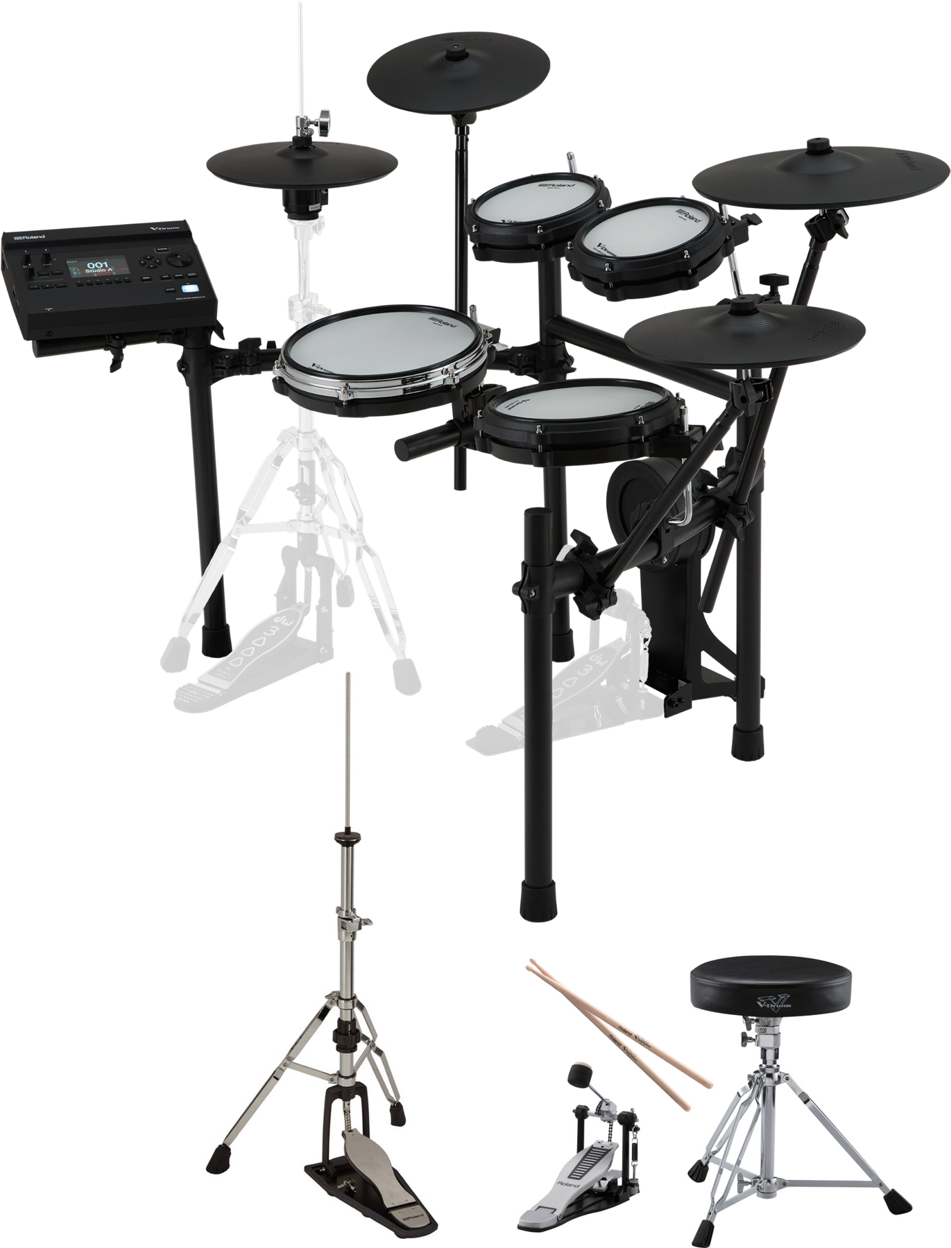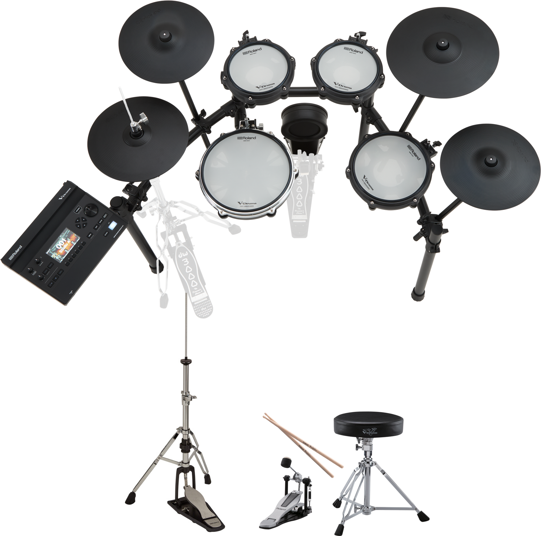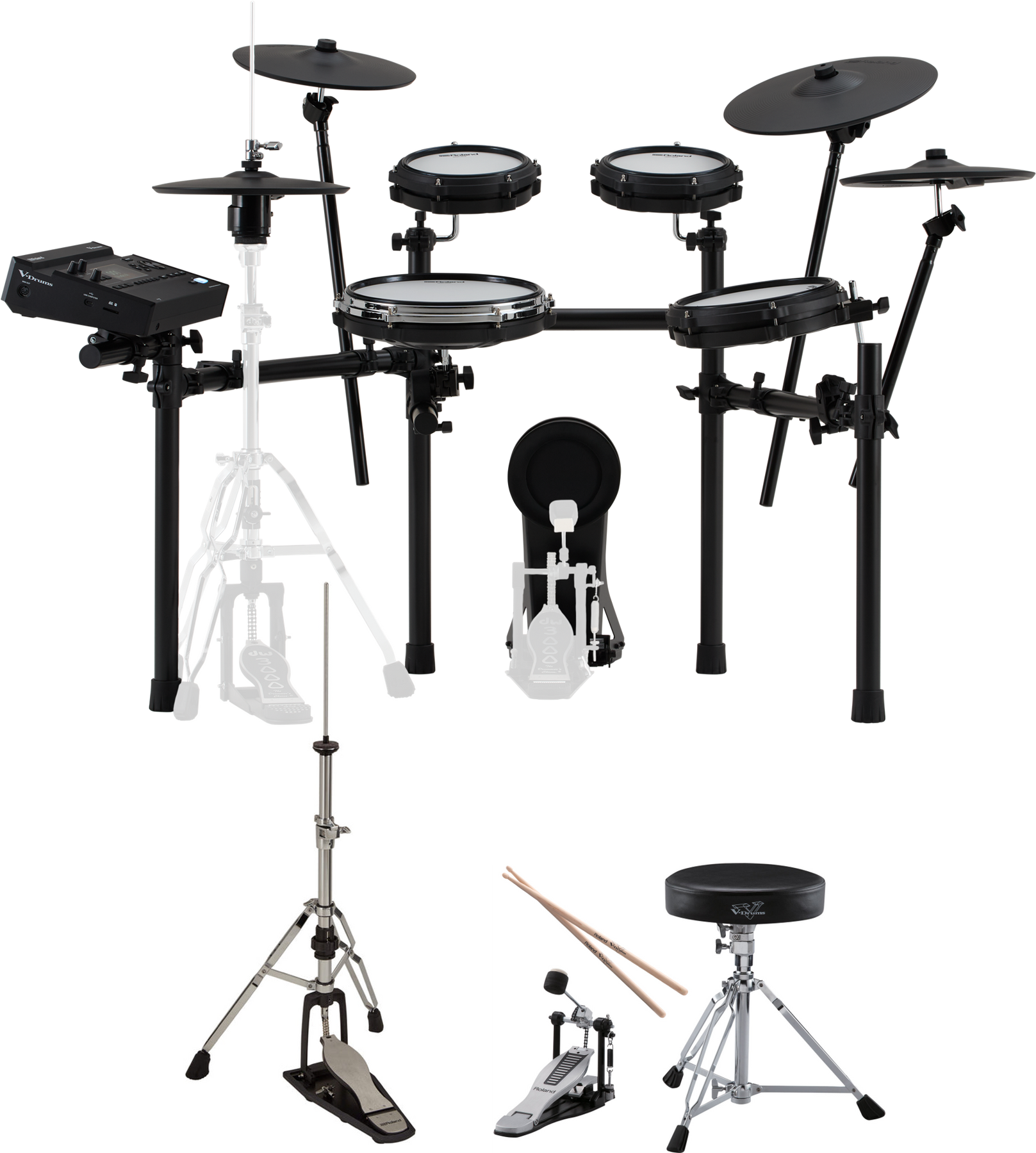 - Mid-level V-Drums 3 Series kit with Roland RDH-120A Hi-hat stand with Integrated Noise Eater and Roland DAP-3X bass drum pdeal, drum throne and sticks pack